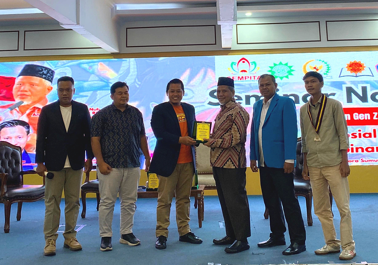 Joko Imawan Menyerahkan Plakat Ucapan Terimakasih Kepada Senator KH. Muhammad Nuh, MSP Dalam Seminar GEN Z Sumatera Utara