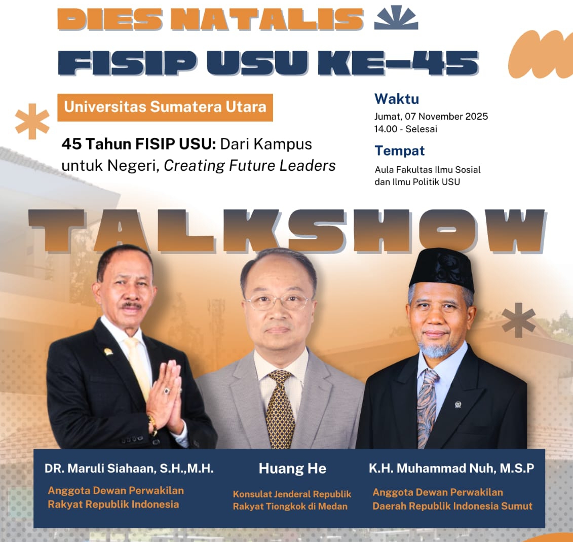 Medan – Wartaindonesia.org- Anggota DPD RI / MPR RI, KH. Muhammad Nuh, MSP Hadiri Dies Natalis Fakultas Ilmu Sosial dan Ilmu Politik (FISIP) Universitas Sumatera Utara (USU) Ke-45, Dengan rangkaian kegiatan yang berlangsung hingga 08 November 2025. Tema yang diusung adalah “Kritis, Kreatif, Kolaboratif: Pemimpin Muda untuk Negeri”. Rangkaian acaranya mencakup acara seperti Talkshow, Fashion Show, Rally Academic, Mobile Legends Tournament, donor darah, temu alumni, dan Fun Walk. (07/11/2025).